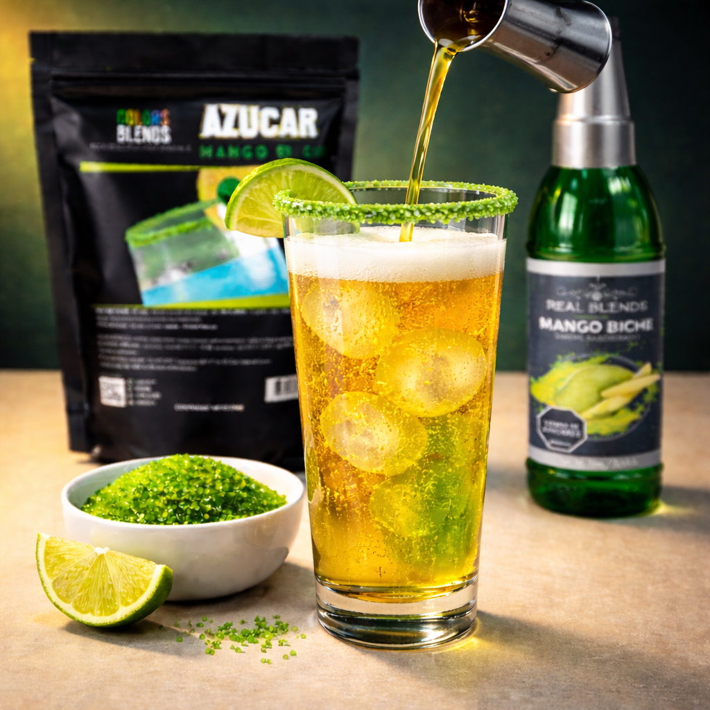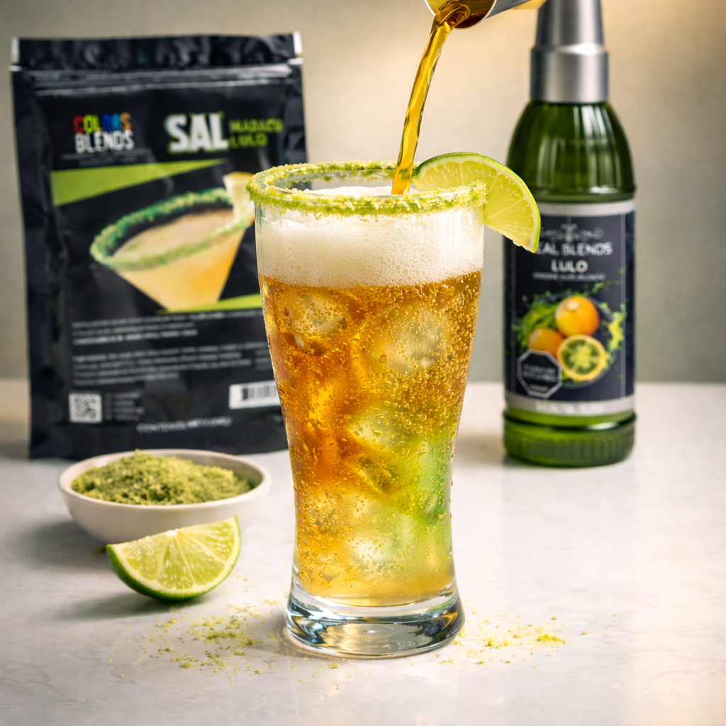 1️⃣ Escarcha el vaso con limón y sal saborizada.